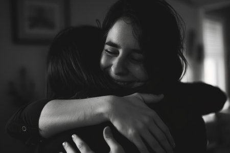 An old woman embrace with her adult daughter. Black and white photography.