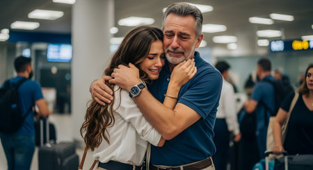 An emotional scene at an airport where an adult daughter and her senior father share a tearful hug. Their expressions convey the sadness of a farewell, representing family bonds, love, departure, and long-distance relationships.