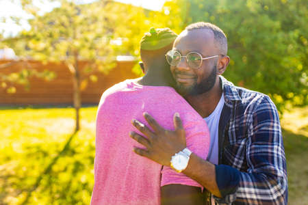 Two African American men embracing each other, showcasing strong friendship and love. Their warm expressions capture a sense of unity and connection.