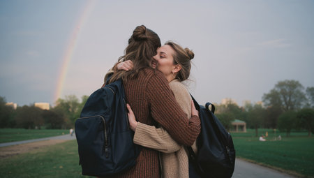 Two friends are hugging in a lush park setting. They enjoy their time together while a rainbow appears in the sky after a light rain, creating a joyful atmosphere.