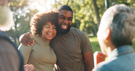 Hug, outdoor and couple with love, sunshine and celebration with joy, romance and relationship in park. People, group and men with women, embrace and summer for fun, cheerful and bonding together