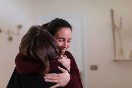 two indian women with bindi on the forehead hugging in living room