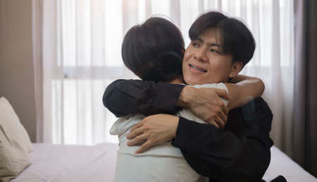 Asian teen gay couple hugging cuddling each other in bedroom. Showing some LGBT affection. Gay in love concept. close-up image