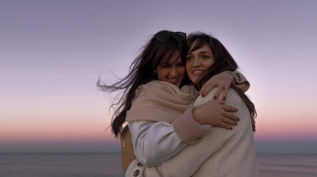 Two beautiful young girls hug and laugh together at the sunset by the sea in Valencia Spain