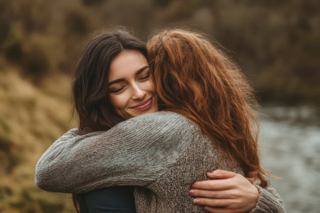 Friends embrace happily by the riverbank, enjoying a peaceful moment in nature amidst green scenery.