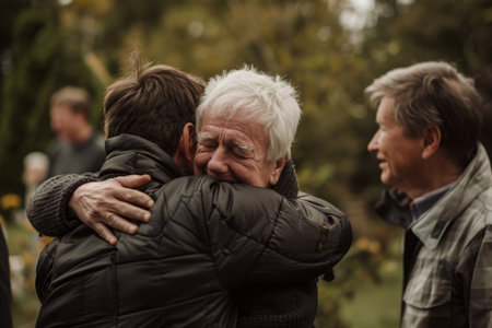 An appreciative father embraces his son during a retirement party with friends in a rural garden
