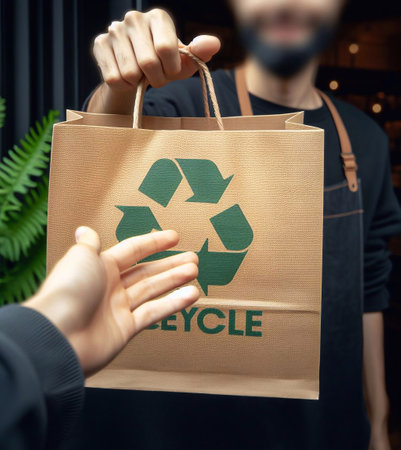 ecological choices and environmental awareness concept, paper bag with Susutainable Products label on it