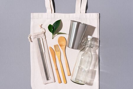Canvas tote bag with sustainable kitchen products: stainless steel bottle, glass bottle, glass jar with wooden cutlery and reusable metal straws. Top view, wooden background.