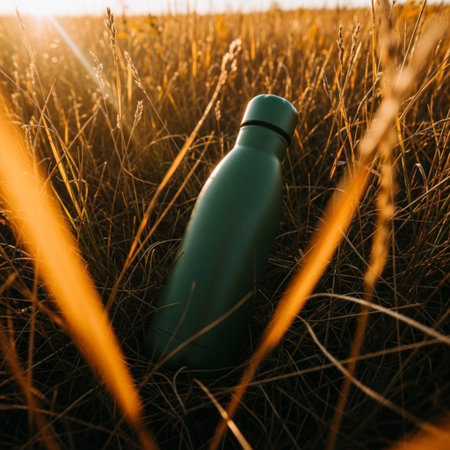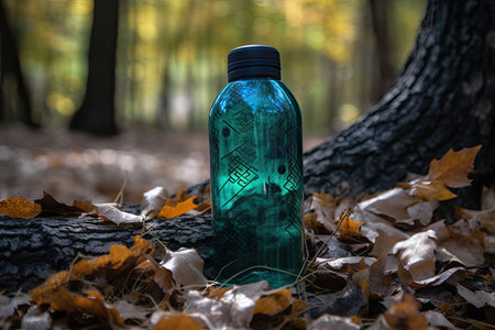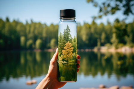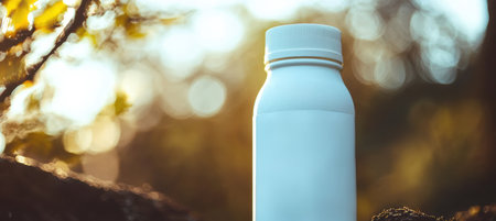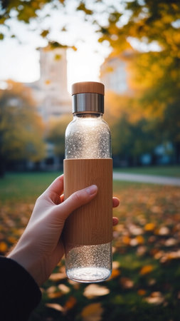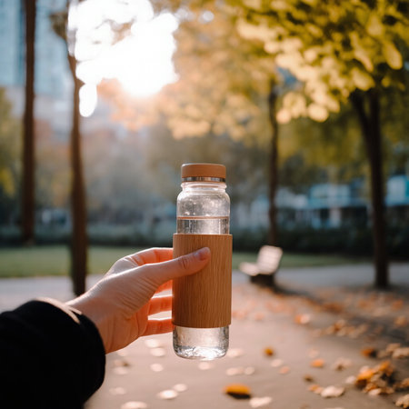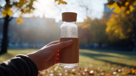 Hand holding eco-friendly glass bottle in a sunny autumn park. Perfect for themes of sustainability, outdoor lifestyle, and mindful living.