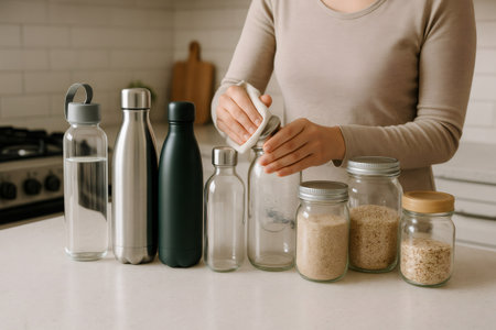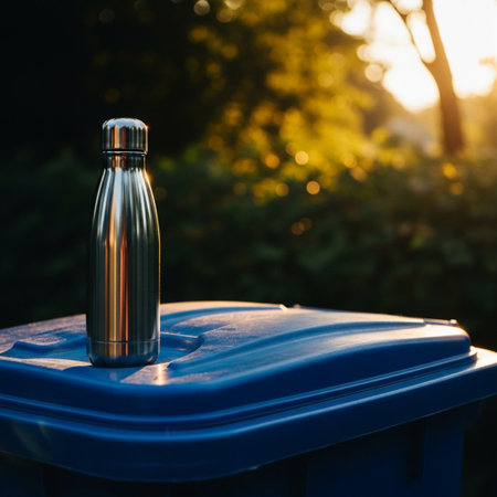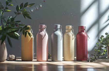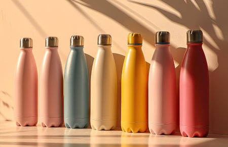 Several reusable bottles in shades of pink, blue, and yellow basking in the soft sunlight, highlighting sustainability.