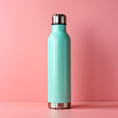 Stay refreshed with a sleek reusable water bottle, promoting hydration and wellness in a stylish clear design against a vibrant coral backdrop