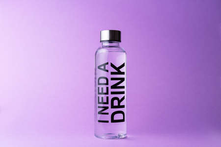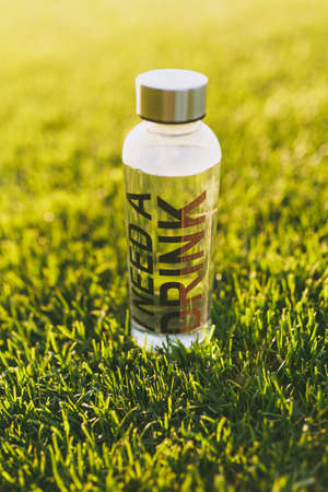 Bottle with fresh clean clear transparent water with text inscription I need drink on green grass on sunshine lawn. Nature texture, green background, wallpaper. Soccer field or sports concept design