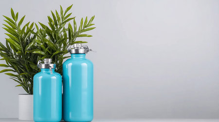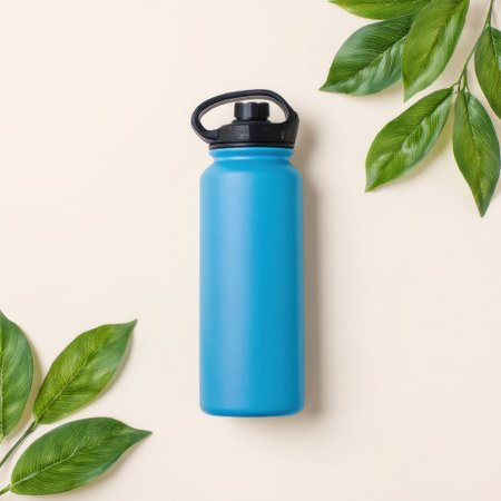 This vibrant blue water bottle sits elegantly beside fresh green leaves, perfect for images promoting hydration and eco-friendly lifestyles on social media or advertisements.