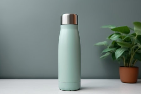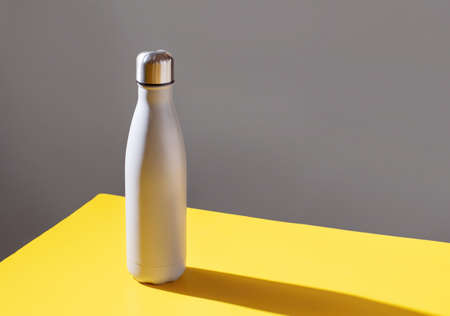 Grey insulated bottle on grey and yellow background close up. Zero waste, plastic free and sustainable lifestyle concept