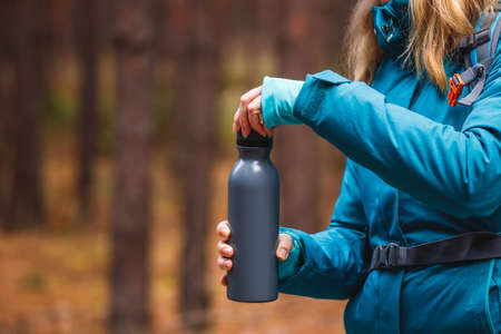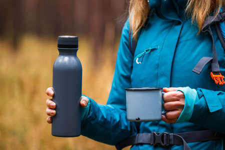 Female hiker holding hot drink and travel mug in forest. Woman hiking and camping outdoors