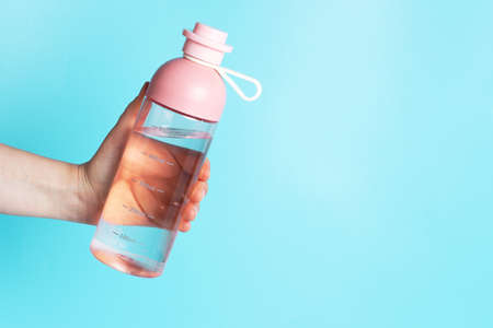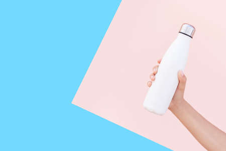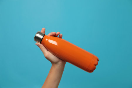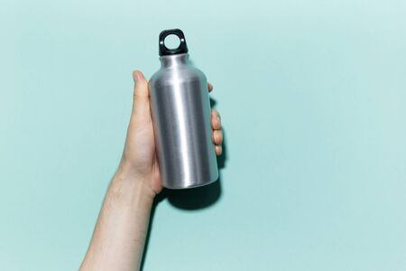 Close-up of male hand holding eco, reusable aluminum thermo water bottle on studio background of cyan, aqua menthe color.