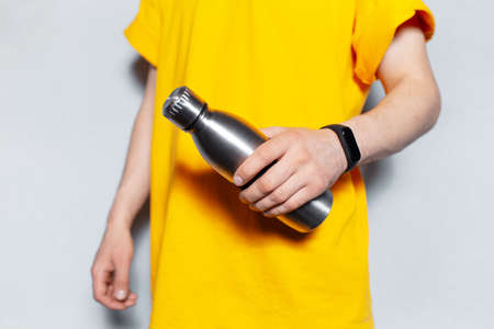 Close-up of male hands holding steel reusable thermo water bottle, wearing yellow shirt on the background of white wall.
