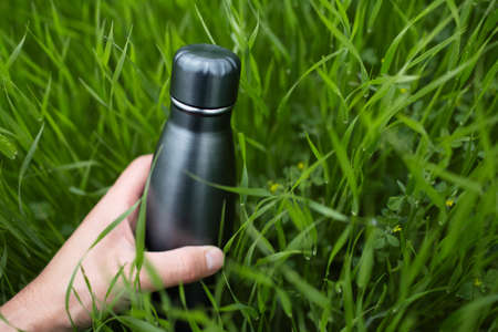 Close-up of male hand holding steel reusable thermo water bottle on background of blurred green grass with copy space.