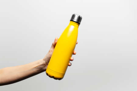Close-up of male hand holding steel eco reusable water bottle of yellow on white.