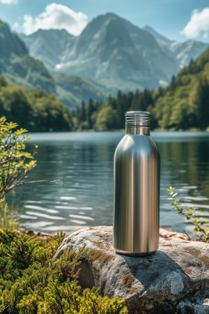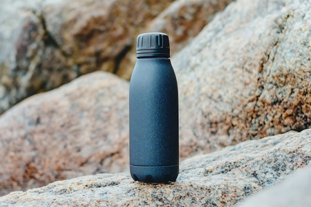 A sleek black insulated water bottle stands beautifully on a rugged rock surface, showcasing functionality for outdoor adventures and stylish hydration.
