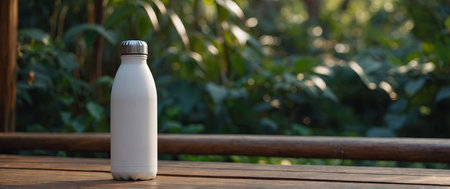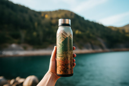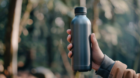 Hand Holding Reusable Thermo Water Bottle With Nature Background.
