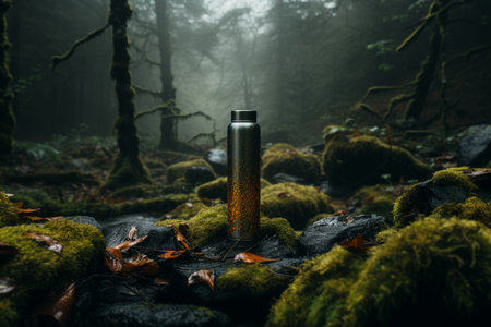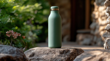 A sleek green water bottle stands on a rock, framed by lush greenery and soft light.