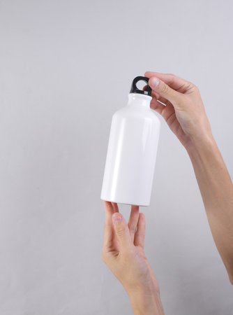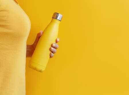 Hand with grey reusable insulated bottle on yellow background. Zero waste, plastic free and sustainable lifestyle concept