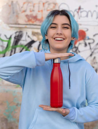 Smiling Teenager in blue hoodie with red water bottle. Blue haired teen girl staying outdoors near graffiti wall. Reusable bottle mockup. Hipster and adolescence concept