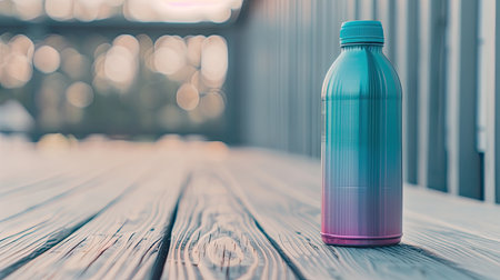 Stylish blue water bottle with wooden lid on a minimalistic gray background, perfect for eco friendly lifestyle and hydration concept