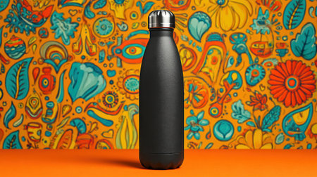A black water bottle is prominently displayed on a bright orange surface, set against a lively background filled with intricate floral designs in various colors and shapes.