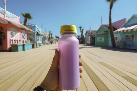 A woman's hand holds a pink bottle with a protein shake on the beach.