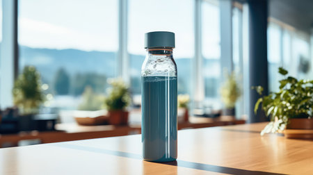 This clear reusable water bottle sits on a light surface, filled with fresh water. It reflects bright light, emphasizing its sleek design and practicality for daily hydration.