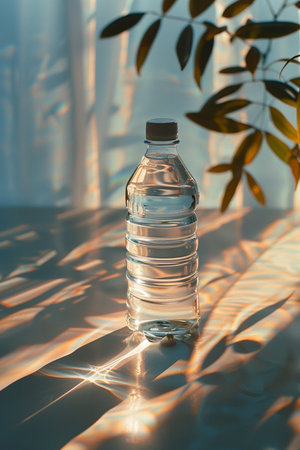 A transparent water bottle with a gray cap, illuminated by warm sunlight, creating vibrant reflections and shadows.