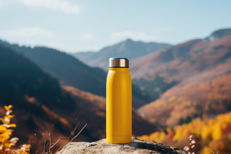 Yellow camping vacuum flask outdoors and autumn mountains scenic view on the background