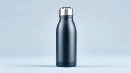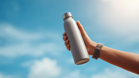 Refreshing image featuring a reusable water bottle covered with condensation, emphasizing the importance of hydration and sustainable lifestyle choices against a vibrant blue backdrop