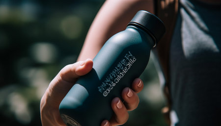 Young adult holding plastic water bottle, exercising outdoors in nature generated by artificial intelligence