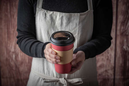 A woman holds a disposable paper glass with coffee by the sea. Front view.