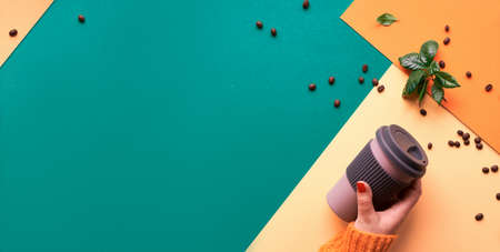 Zero waste coffee. Eco friendly reusable coffee cups in hands, geometric top view on split paper in green, yellow and orange color tones. Panoramic banner design with copy-space, place for text..