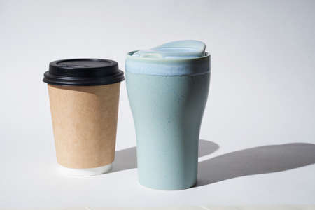 Reusable coffee cup vs disposable cups. Pink background. Zero waste concept. Copy space for your text.