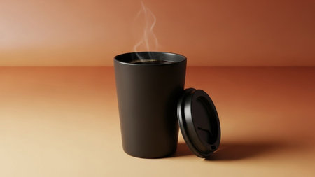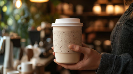 At a bustling café a person holds a reusable coffee cup promoting eco friendly choices and minimizing single use waste during their visit.
