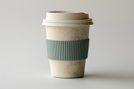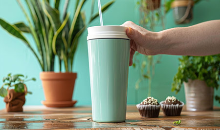 Hand holding green reusable cup with recycle symbol for promoting environmental awareness