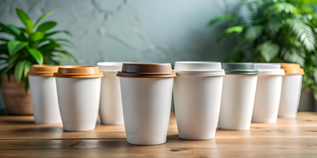A row of six blank. white takeaway coffee cups with colored lids sit on a wooden table. The cups are perfect for showcasing your brand or design with a modern. clean aesthetic.
