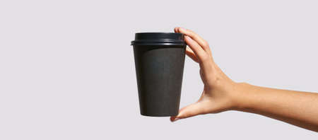 Girl hold paper cup. Grey background with copy space. Female arm holding paper glass. To go, away. No ecology. Without shadows. Horizontal banner