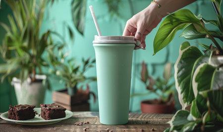 Refreshing Iced Beverage and Indulgent Chocolate Brownie in a Vibrant, Nature-Inspired Cafe Setting