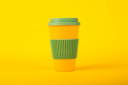 Ecological cup for coffee with green lid on the yellow background. Sustainable lifestyle. Front view.