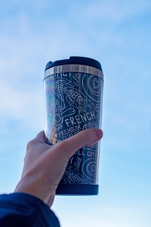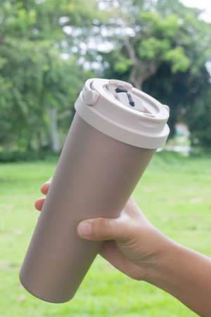 Thermo mug with coffee in the fresh air, on the background of the embankment