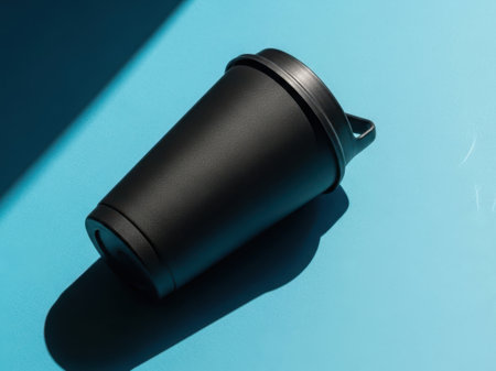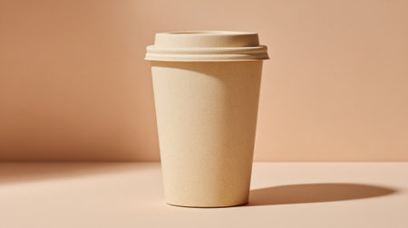A plain brown paper cup rests on a smooth surface casting a soft shadow in warm light.