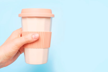 Hand holding eco coffee cup on wooden background. Coffee cup from bamboo fiber, zero waste concept. Ban single use plastic. Take away coffee in your cup. Sustainable lifestyle