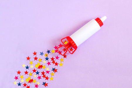Confectionery syringe in form of rocket with train of stars of confetti on lilac background. Minimal style. Creative idea, imagination and fantasy. Festive space concept