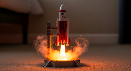 This captivating image features a vintage rocket model positioned on a carpet, illuminated by soft natural light, evoking nostalgia and creativity.